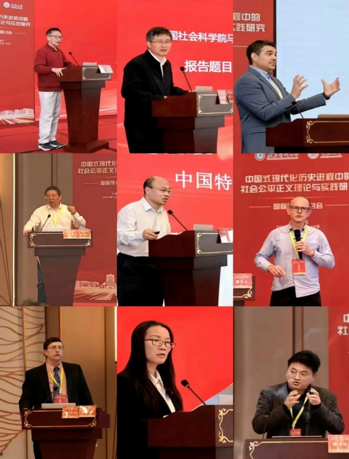 来自高校和研究机构的十一位专家学者先后进行了主旨报告发言。中国文化软实力研究中心主任、湖南大学马克思主义学院张国祚教授着重分析了“中国式现代化”与“公平正义”的关系问题,并从“第二个结合”的角度阐释了公平正义的含义,用中华优秀传统文化解释公平就是不分大小、高低、贵贱、强弱,大家在面对利益分配时都是平等的,而正义则是大不欺小、高不贬低、贵不鄙贱、强不凌弱;中国辩证唯物主义研究会公平正义专业委员会会长、重庆大学马克思主义学院院长冯颜利教授以如何实现公平正义为切入点,指出实现公平正义必须坚持量力与尽力的辩证统一,认为要在量力与尽力的辩证统一中将公平正义作为二者的共同支点,形成交叉共识。用公平正义解决冲突,有助于将近期与远期目标、个人与集体利益统一起来,实现国家、社会、个人共同发展;美国中美后现代发展研究院副院长克里福德·柯布(Clifford William Cobb)研究员主要从何为有机正义、有机正义的特征、有机正义的主体与问题这三个方面展开论述,指出有机正义是构建生态文明的重要推动力量。中国社会科学院马克思主义研究院纪委书记、副院长陈志刚研究员指出新时代将公平正义摆在了前所未有的崇高位置,以新发展理念引领公平正义的实现,用制度建设保证公平正义的实施,是新时代关于公平正义新观点新思想的具体体现。复旦大学哲学学院王凤才教授深度剖析了“现代”“现代性”“现代化”“中国式现代化”的概念缘起和核心内涵,指出中国式现代化之路创造了具有中国特色的新文明类型,未来文明建设的基本原则是中国立场、世界眼光、交流互鉴、共创未来;中山大学文化强国研究院执行院长、马克思主义学院林进平教授认为,中国特色社会主义公平正义蕴含着三个相互关联的限定,即“社会主义”的,注重“公平”的,有“中国特色”的,是“多数人、重分配、情理交融”的社会主义正义;上海交通大学马克思主义学院杜玉华教授从“何为-为何-如何”的逻辑思路出发,对橄榄型分配的理论内涵、价值意义及构建路径进行了论述;美国过程研究中心执行主任威廉·安德鲁·施瓦茨(William Andrew Schwartz)研究员从公平本体论意义出发,结合过程哲学视角,提出了以关系为核心的整体正义观;中国人民大学哲学院薄国强(Roland Theodore Boer)教授认为,必须用辩证方法理解和阐释西方自由主义的正义观和马克思主义的正义观,认为马克思主义最重要的是实践的正义,提供了一个更高、更全面的正义观。武汉大学哲学学院院长李佃来教授认为,无论是从理论维度还是实践维度来讲,中国式现代化都蕴含着对社会公平正义的价值追求。兰州大学马克思主义学院院长蔡文成教授认为有些西方学者借“自由—威权”话语陷阱制造“全球民主威胁论”,实质是维护西方话语霸权,中国需以治理效能、自主叙事和国际传播重塑民主认知。