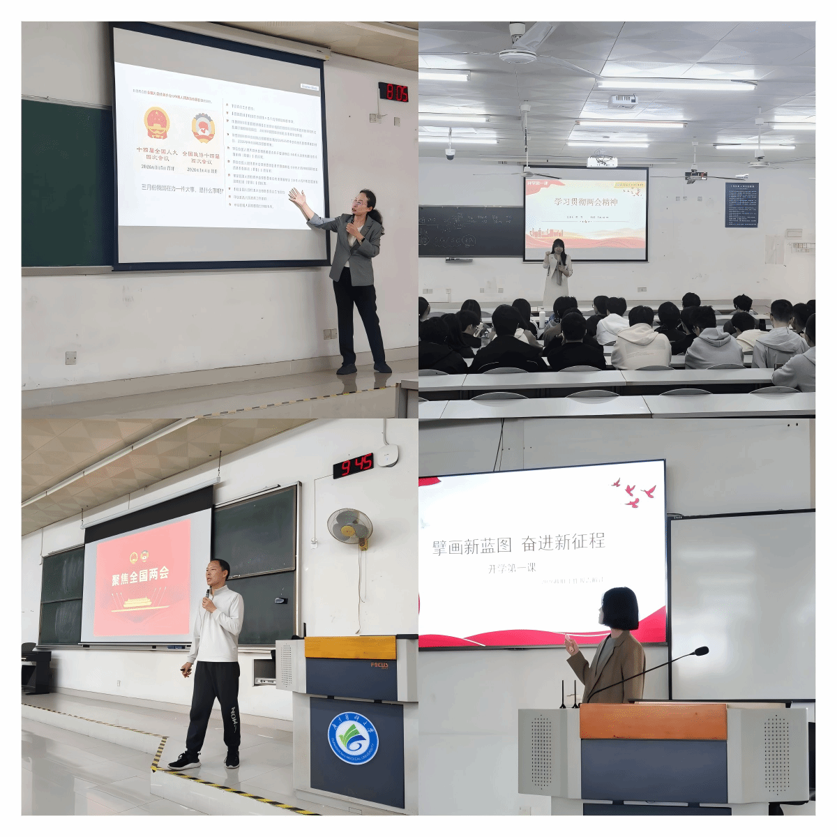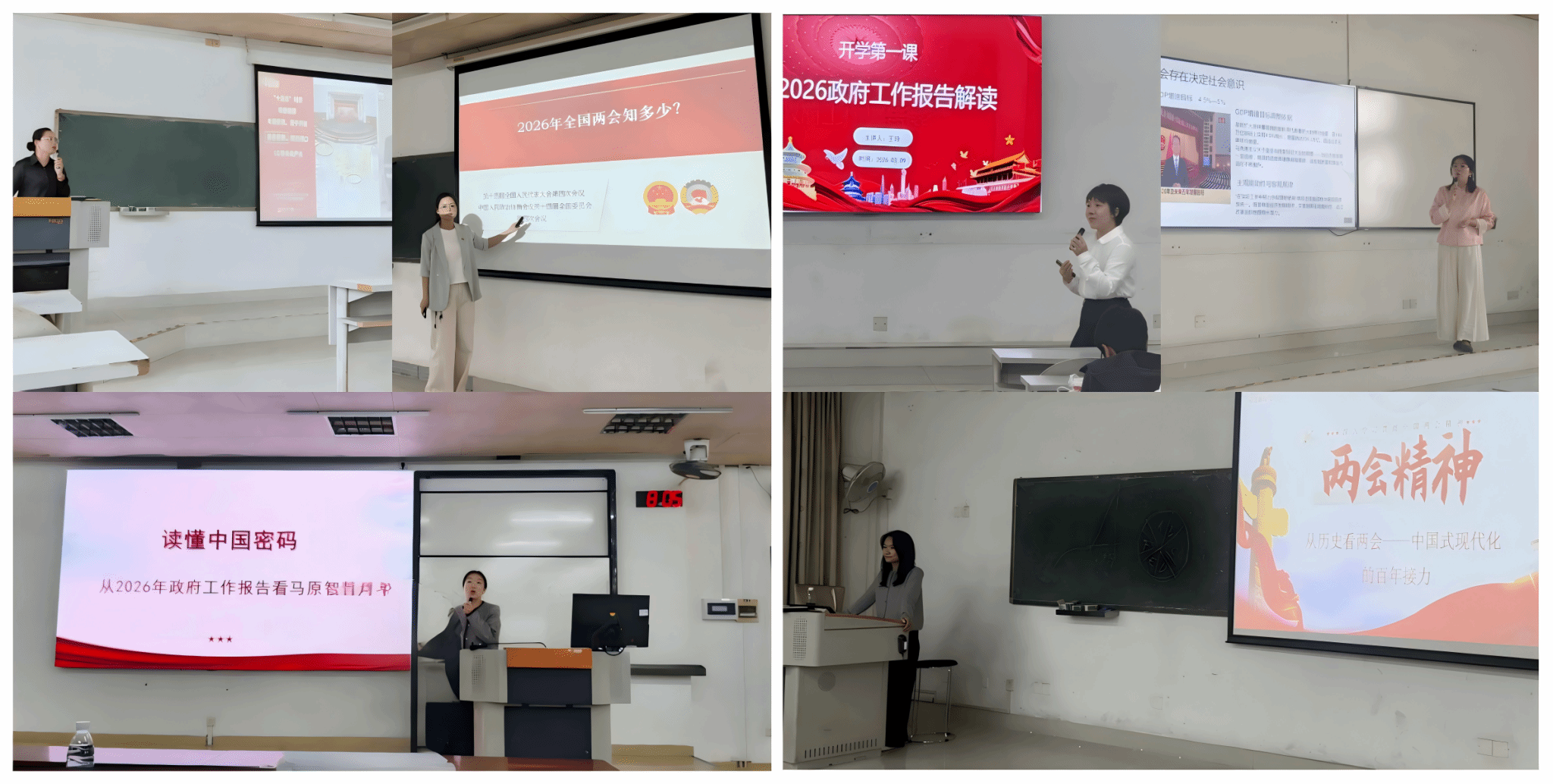 3月9日,新学期的第一次课堂上,老师们以饱满的热情、昂扬的斗志,对课程教学内容的讲解深入浅出、娓娓道来。在“思政第一课”环节,贺兰英、沈丽平、明芳、王玉荣几位老师以全国两会为主题,向同学们讲授了全国两会的相关常识以及今年两会关注的重点内容;杜巧玲、王玲、索绳斐、王景、朱春燕几位老师则以2026年政府工作报告与课程的衔接作为教学主题;王艳利老师重点介绍了“十五五”时期重点培育的未来产业。