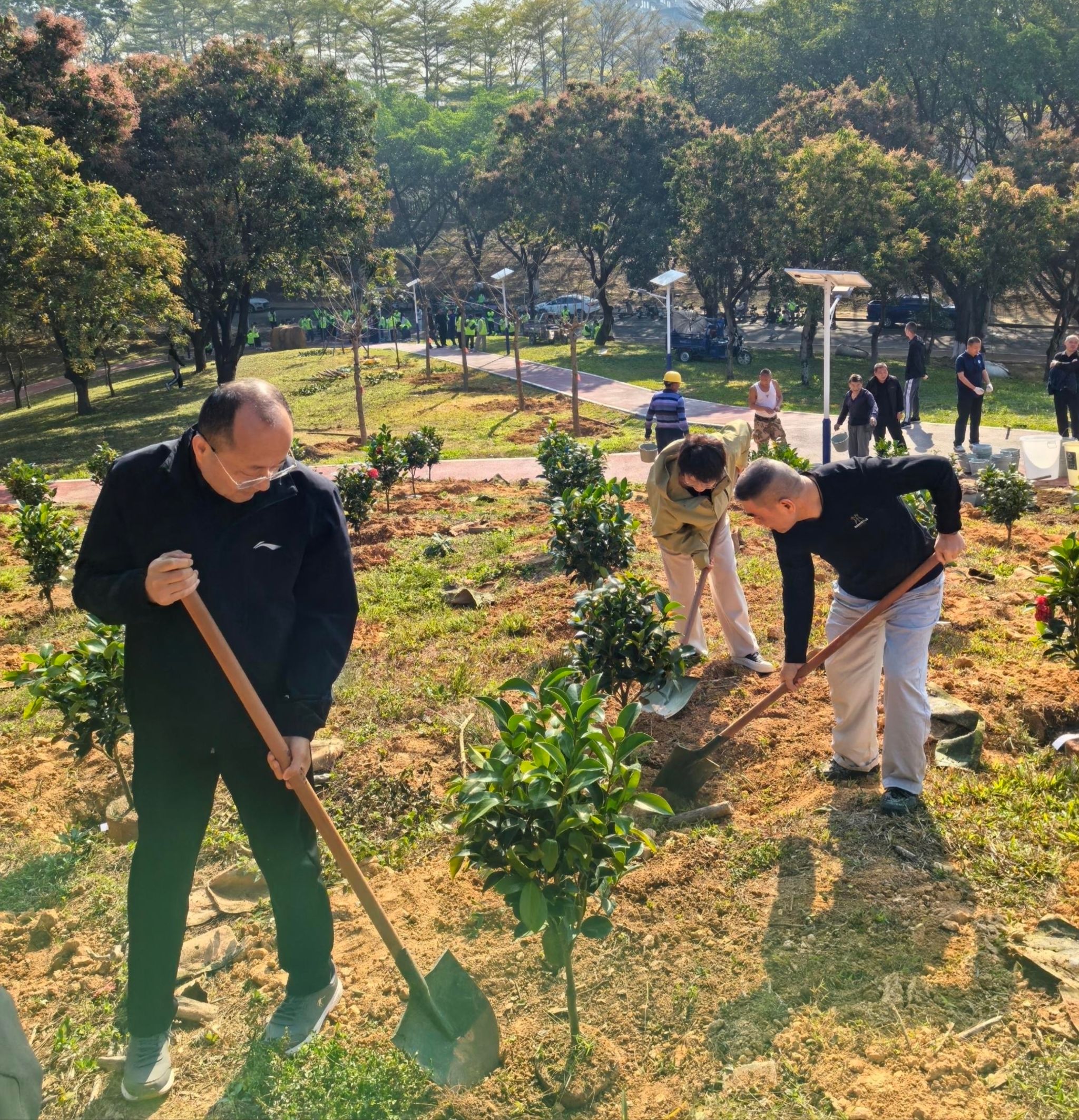 上午9时,阳光和煦,知园里一片忙碌景象。马克思主义学院党委书记茹正开领学了学校党委发布的倡议书,强调要争当绿美理念的“倡导者”、植树造林的“践行者”、绿美家园的“守护者”。党员同志们深受鼓舞,纷纷拿起铁锹、锄头等工具,投入到茶花树苗的种植中。大家分工协作,扶苗培土,每一个环节都认真细致。经过一番劳动,十余株茶花树苗在知园“安家落户”,迎风挺立,为校园增添了一抹新绿。参与活动的党员教师表示,种植茶花树苗寓意着希望与美好,也象征着马克思主义学院扎根大地、铸魂育人的初心。